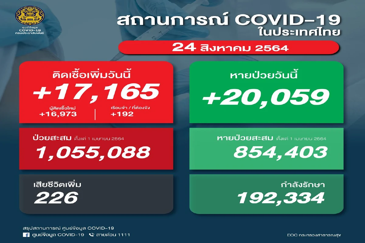 -ผู้ติดเชื้อเพิ่มขึ้นรวม 17,165 ราย จำแนกเป็น ติดเชื้อใหม่ 16,973 ราย, ติดเชื้อภายในเรือนจำ/ที่ต้องขัง 192 ราย