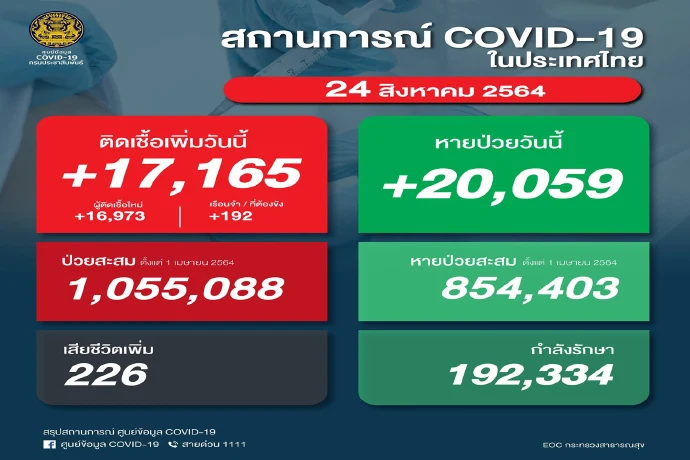 ศบค.รายงานสถานการณ์โควิดวันนี้ พบผู้ติดเชื้อเพิ่มขึ้น 17,165 ราย เสียชีวิตเพิ่ม 226 ราย หายป่วยกลับบ้าน 20,059 ราย ผู้เหลือผู้ป่วยกำลังรักษา 192,334 ราย