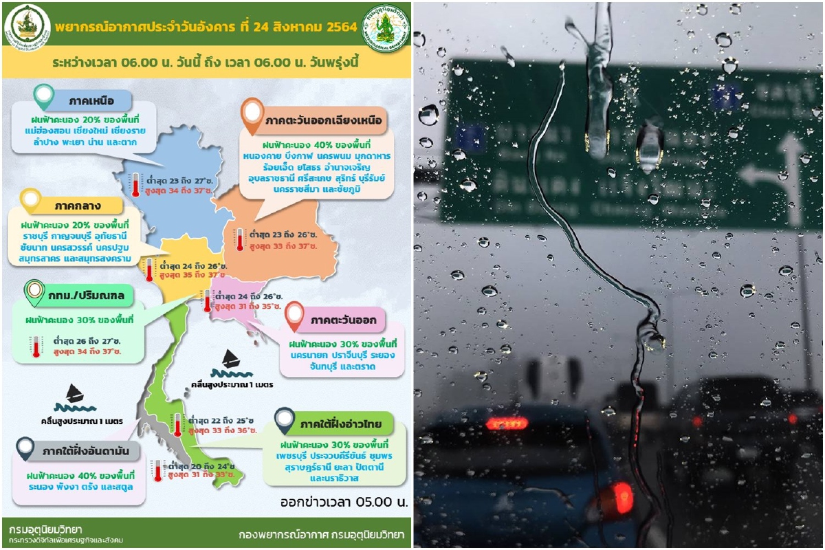 เมื่อวันที่ 24 ส.ค. 64 กรมอุตุนิยมวิทยารายงานลักษณะอากาศทั่วไป ดังนี้ พยากรณ์อากาศ 24 ชั่วโมงข้างหน้า มรสุมตะวันตกเฉียงใต้ที่พัดปกคลุมทะเลอันดามัน ประเทศไทย และอ่าวไทยมีกำลังอ่อน แต่ยังคงทำให้ประเทศไทยมีฝนฟ้าคะนองเกิดขึ้นในระยะนี้