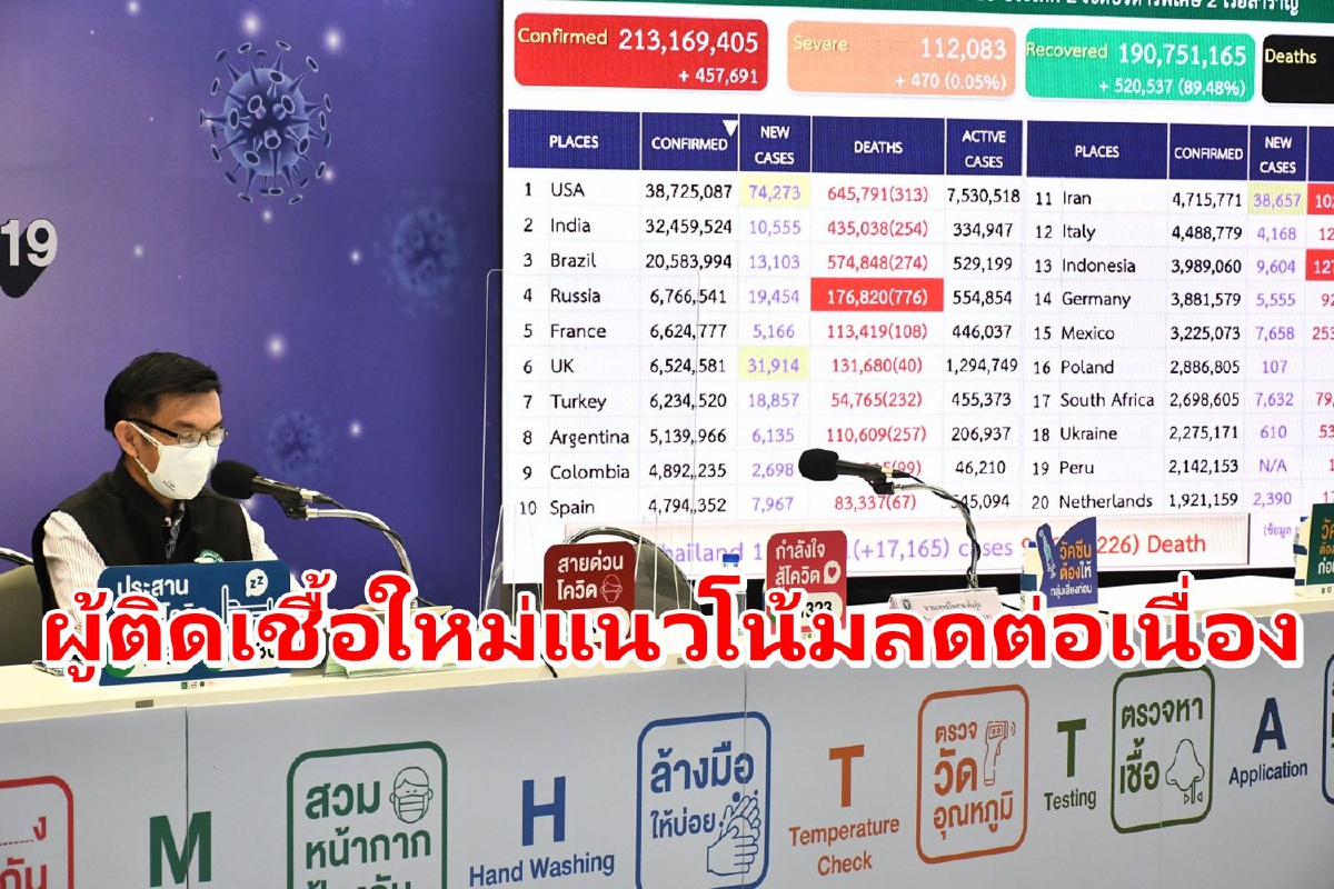 นายแพทย์เฉวตสรร นามวาท ผู้อำนวยการกองควบคุมโรคและภัยสุขภาพในภาวะฉุกเฉิน กรมควบคุมโรค แถลงสถานการณ์โรคโควิด 19 ว่า วันนี้ประเทศไทยมีผู้ติดเชื้อโควิด 19 รายใหม่ 17,165 ราย ถือว่าลดลงอย่างต่อเนื่องจากก่อนหน้านี้ที่อยู่ประมาณหลัก 2 หมื่นรายตั้งแต่ต้นเดือนสิงหาคม มีผู้หายป่วยเพิ่มขึ้น 20,059 ราย ถือว่าสูงกว่าผู้ติดเชื้อรายใหม่
