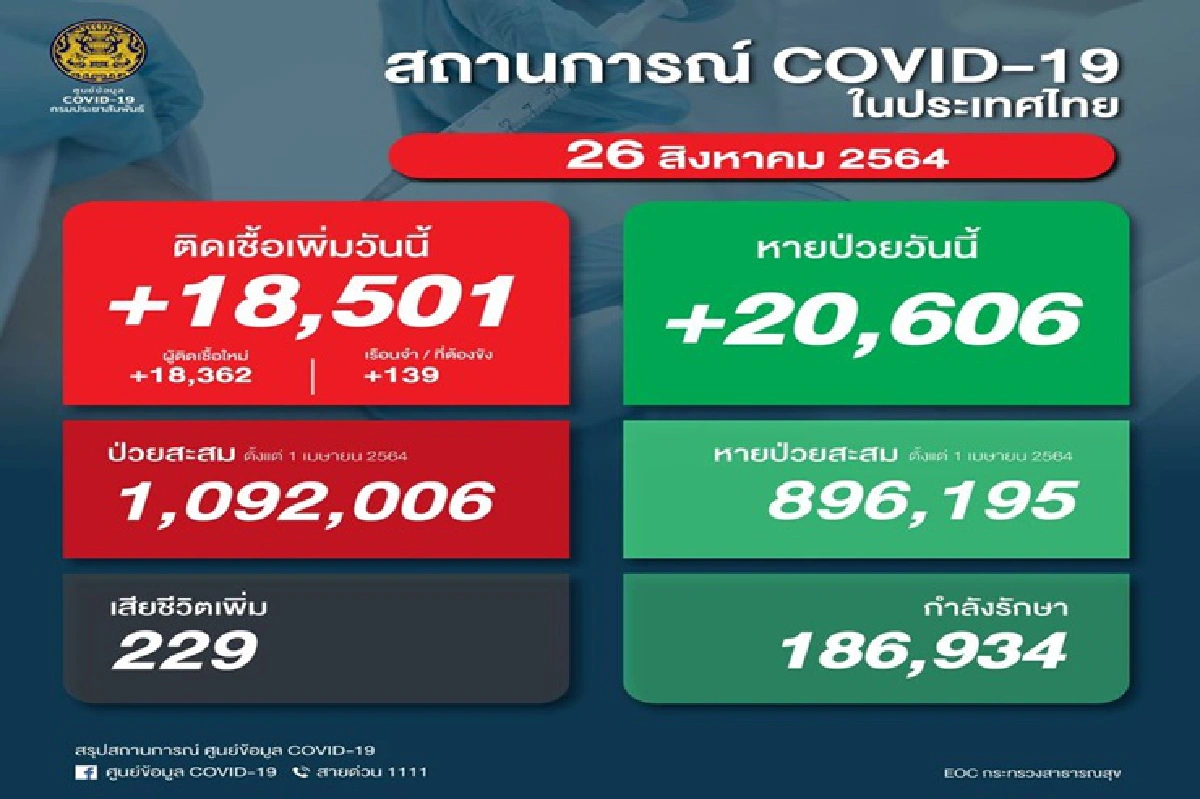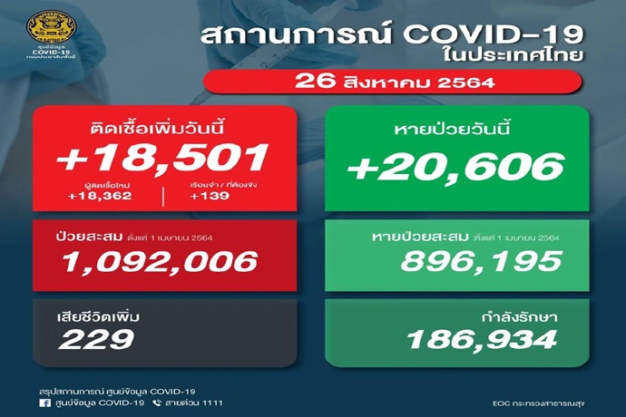 ศบค. เผย ยอดติดเชื้อโควิด-19 วันนี้ เพิ่มขึ้น 18,501 ราย เสียชีวิตอีก 229 ราย หายป่วยกลับบ้าน20,606 ราย เหลือกำลังรักษา 186,934 ราย