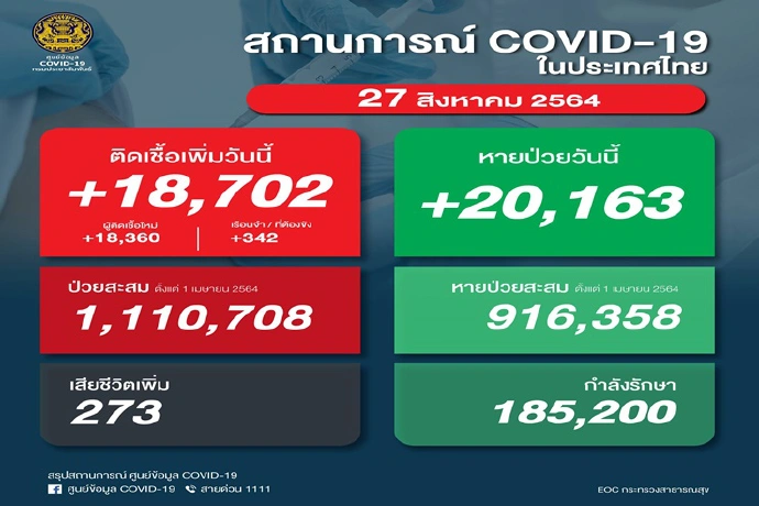 ศบค. เผย ยอดติดเชื้อโควิด-19 วันนี้ เพิ่มขึ้น 18,702 ราย เสียชีวิตอีก 273 ราย หายป่วยกลับบ้าน20,163 ราย เหลือกำลังรักษา 185,200 ราย