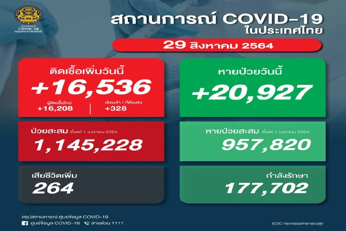 ศบค.รายงานยอดโควิดวันนี้ พบผู้ติดเชื้อเพิ่มขึ้น 16,536 ราย เสียชีวิตอีก 264 ราย เหลือผู้ป่วยกำลังรักษา 177,702 ราย