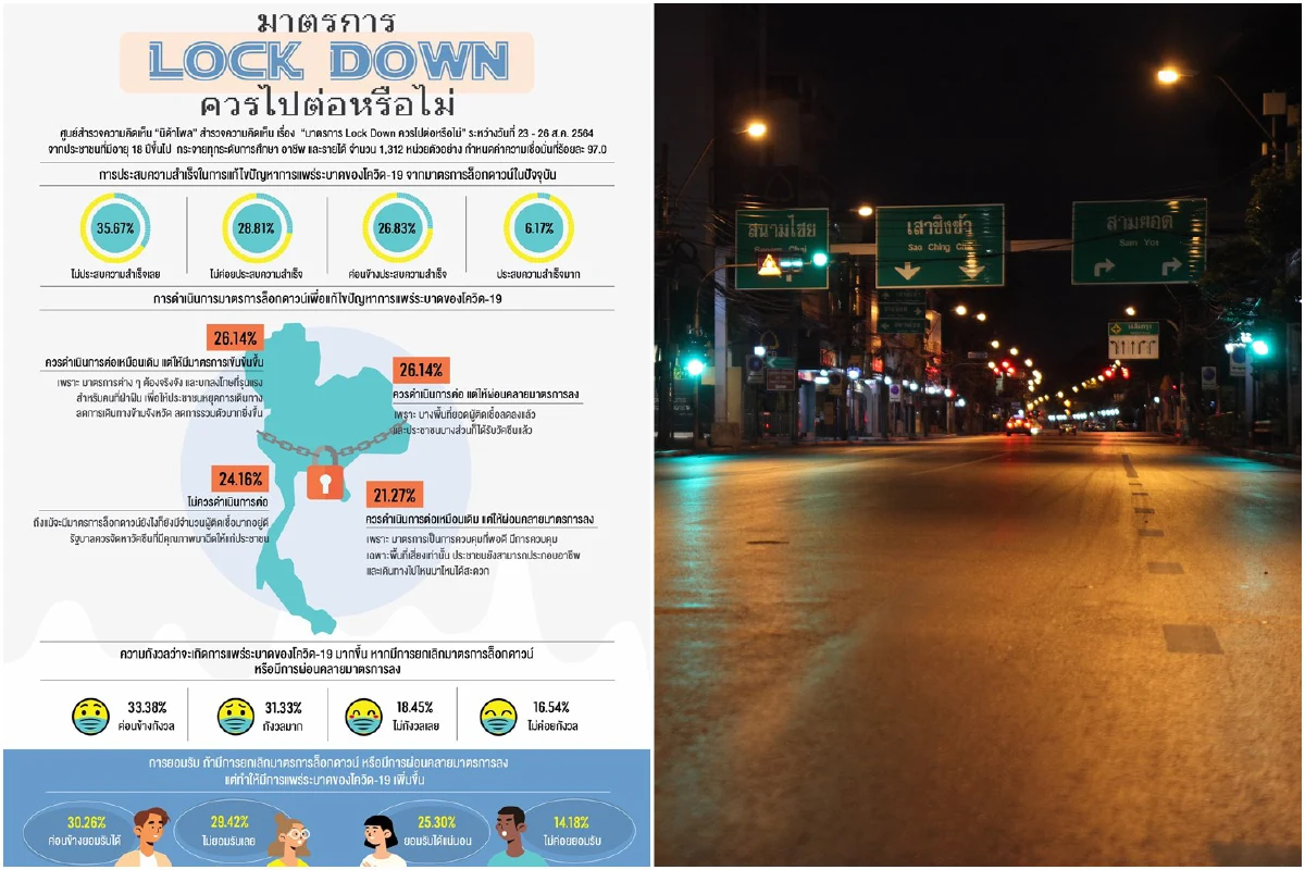 นิด้าโพลเผยคนส่วนใหญ่มองมาตรการล็อคดาวน์สกัดโควิดไม่ประสบความสำเร็จเหตุไม่มีความเข้มงวด แนะควรดำเนินการต่อ แต่ให้มีมาตรการเข้มข้นขึ้น ยอมรับกังวลการแพร่ระบาดเพิ่มหากผ่อนคลาย