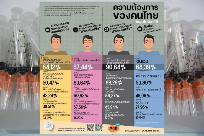 สวนดุสิตโพล มหาวิทยาลัยสวนดุสิต สำรวจความคิดเห็นของประชาชนต่อกรณี ความต้องการของคนไทย ในยุคโควิด-19 กลุ่มตัวอย่าง 1,510 คน ระหว่างวันที่ 23-26 สิงหาคม 2564 พบว่า ความต้องการอันดับ 1 ของประชาชน ณ วันนี้ คือ การมีวัคซีนที่มีประสิทธิภาพ ประชาชนได้ฉีดวัคซีนครบทุกคน ร้อยละ 84.12 โดยความหวังที่คิดว่าน่าจะสมหวัง คือ การได้รับถุงยังชีพ อาหาร น้ำดื่ม ร้อยละ 67.44 ความหวังที่คาดว่าน่าจะผิดหวัง คือ รัฐบาลจริงใจ ในการแก้ปัญหา ร้อยละ 90.64 ตัวช่วยที่ประชาชนฝากความหวังมากที่สุด คือ ตนเอง ร้อยละ 68.39