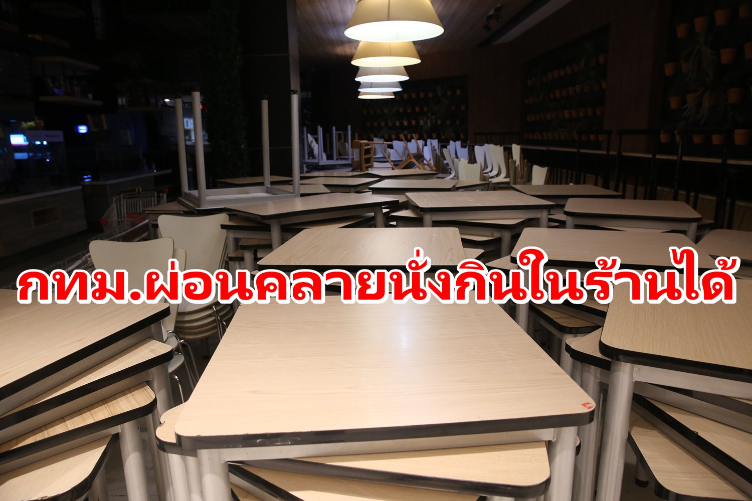 กทม.ออกประกาศผ่อนคลายให้นั่งรับประทานในร้านอาหารได้ โดยร้านไม่มีเครื่องปรับอากาศนั่งได้ 75%ของจำนวนที่นั่งทั้งหมด ร้านมีเครื่องปรับอากาศนั่งได้ 50%