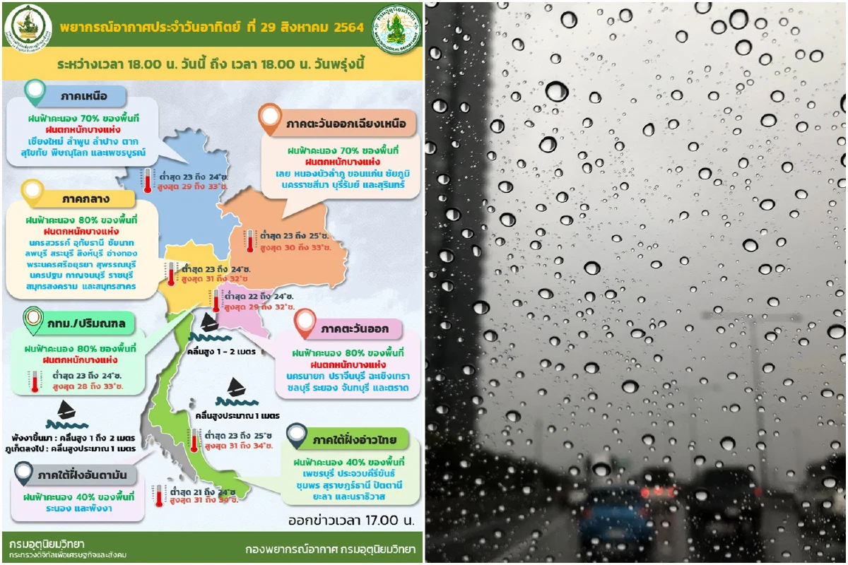 เมื่อวันที่ 30 ส.ค. 64 กรมอุตุนิยมวิทยารายงาน ลักษณะอากาศทั่วไปดังนี้ พยากรณ์อากาศ 24 ชั่วโมงข้างหน้า ร่องมรสุมพาดผ่านภาคกลาง ภาคตะวันออก และภาคตะวันออกเฉียงเหนือตอนล่าง เข้าสู่หย่อมความกดอากาศต่ำบริเวณทะเลจีนใต้ตอนกลาง ประกอบกับมรสุมตะวันตกเฉียงใต้ยังคงพัดปกคลุมทะเลอันดามัน ประเทศไทย และอ่าวไทย