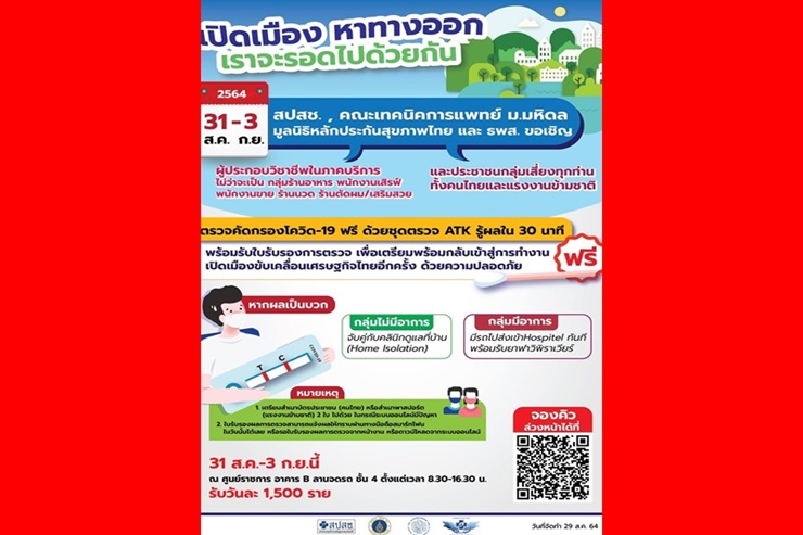 ทพ.อรรถพร ลิ้มปัญญาเลิศ รองเลขาธิการสำนักงานหลักประกันสุขภาพแห่งชาติ (สปสช.) เปิดเผยว่า สปสช.อร่วมมือกับคณะเทคนิคการแพทย์ มหาวิทยาลัยมหิดล, บริษัท ธนารักษ์พัฒนาสินทรัพย์ จำกัด (ธพส.) และมูลนิธิหลักประกันสุขภาพไทย จัดโครงการตรวจคัดกรองโควิด-19 ด้วย Antigen Test Kit (ATK) ในวันที่ 31 ส.ค.-3 ก.ย. 2564 นี้ โดยขอเชิญกลุ่มผู้ประกอบวิชาชีพในภาคบริการ ไม่ว่าจะเป็นกลุ่มร้านอาหาร พนักงานเสิรฟ์ พนักงานขาย ร้านนวด ร้านตัดผม/เสริมสวย และประชาชนกลุ่มเสี่ยงทั้งคนไทยและแรงงานข้ามชาติ มารับการตรวจได้ที่ลานจอดรถชั้น 4 อาคารบี ศูนย์ราชการเฉลิมพระเกียรติฯ ถ.แจ้งวัฒนะ ตั้งแต่เวลา 8.30-16.30 น. เบื้องต้นตั้งเป้าว่าจะตรวจให้ได้ประมาณวันละ 1,500 ราย