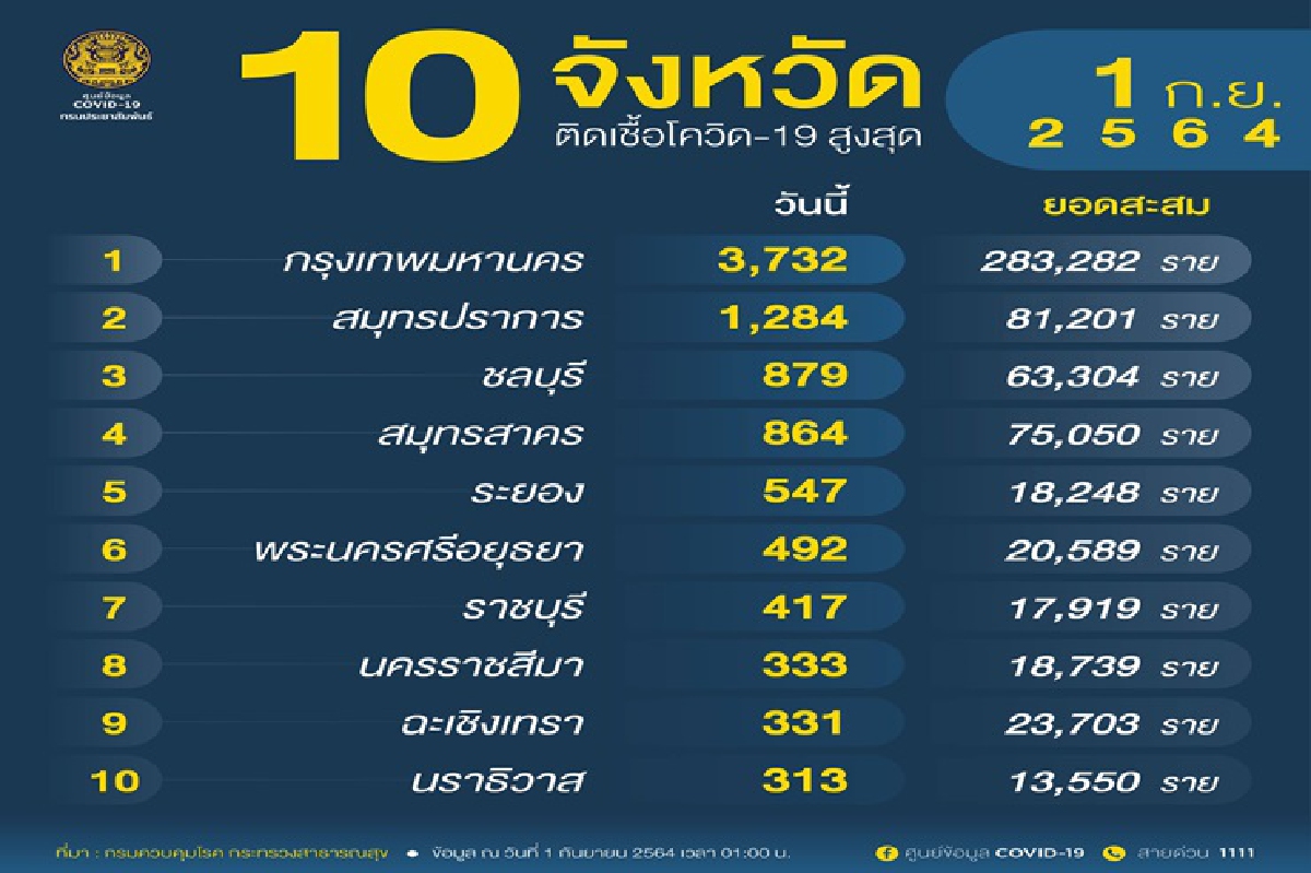 -จํานวนผู้ติดเชื้อโควิดในประเทศรายใหม่ วันนี้ 10 จังหวัดอันดับแรก 1.กรุงเทพมหานคร 3,732 ราย 2.สมุทรปราการ1,284 ราย 3.ชลบุรี 879 ราย 4.สมุทรสาคร 864 ราย 5.ระยอง 547 ราย 6.พระนครศรีอยุธยา 492 ราย 7.ราชบุรี 417 ราย 8.นครราชสีมา 333 ราย 9.ฉะเชิงเทรา 331 ราย และ 10.นราธิวาส 313 ราย