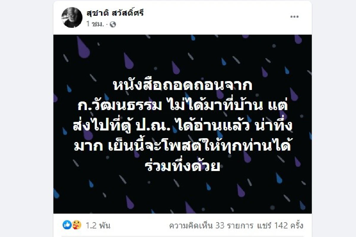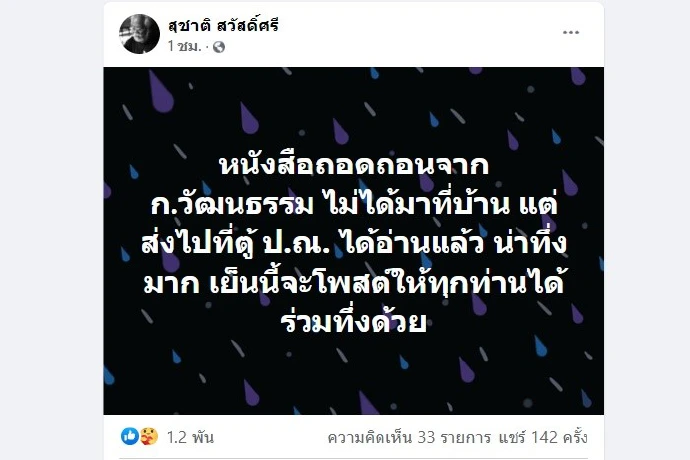 ล่าสุด สุชาติ โพสต์ข้อความผ่านทางเฟซบุ๊ก สุชาติ สวัสดิ์ศรี ระบุว่า หนังสือถอดถอนจาก ก.วัฒนธรรม ไม่ได้มาที่บ้าน แต่ส่งไปที่ตู้ ป.ณ. ได้อ่านแล้ว น่าทึ่งมาก เย็นนี้จะโพสต์ให้ทุกท่านได้ร่วมทึ่งด้วย