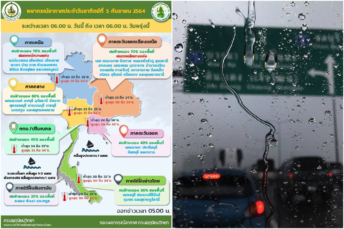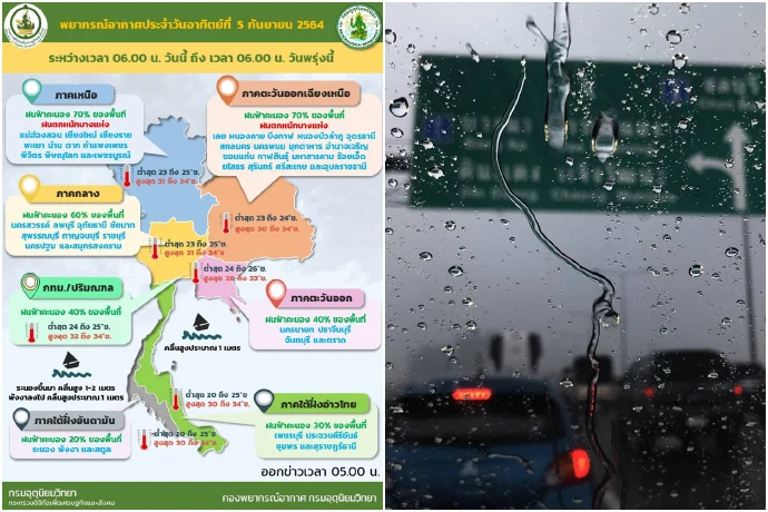 เมื่อวันที่ 5 ก.ย. 64 กรมอุตุนิยมวิทยารายงาน ลักษณะอากาศทั่วไปว่า พยากรณ์อากาศ 24 ชั่วโมงข้างหน้า ร่องมรสุมพาดผ่านภาคเหนือ ภาคตะวันออกเฉียงเหนือตอนบน และประเทศลาวตอนบน เข้าสู่หย่อมความกดอากาศต่ำบริเวณประเทศเวียดนามตอนบน ประกอบกับมรสุมตะวันตกเฉียงใต้กำลังปานกลางพัดปกคลุมทะเลอันดามัน ประเทศไทย และอ่าวไทย ลักษณะเช่นนี้ทำให้ภาคเหนือ และภาคตะวันออกเฉียงเหนือ ยังคงมีฝนตกหนักบางแห่ง ขอให้ประชาชนที่อาศัยอยู่ในพื้นที่เสี่ยงภัยในบริเวณดังกล่าว ระวังอันตรายจากฝนตกหนักและฝนที่ตกสะสมซึ่งอาจทำให้เกิดน้ำท่วมฉับพลันและน้ำป่าไหลหลากในระยะนี้