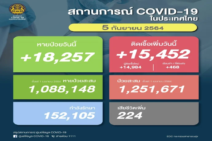 ศบค.รายงานสถานการณ์โควิดวันนี้พบผู้ติดเชื้อเพิ่ม 15,452 ราย เสียชีวิตอีก 224 ราย หายป่วยเพิ่ม 18,257 ราย กำลังรักาา 152,105 ราย