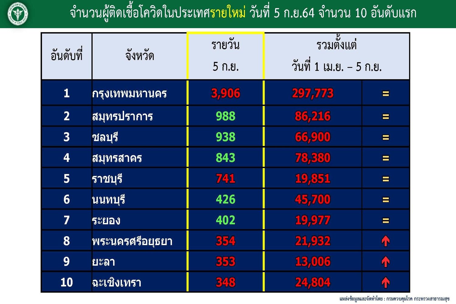 -จังหวัดที่มีผู้ติดเชื้อรายใหม่ 10 อันดับแรก ได้แก่ กรุงเทพฯ 3,906 ราย สมุทรปราการ 988 ราย ชลบุรี 938 ราย สมุทรสาคร 843 ราย ราชบุรี 741 ราย นนทบุรี 426 ราย ระยอง 402 ราย พระนครศรีอยุธายา 354 ราย ยะลา 353 ราย และ ฉะเชิงเทรา 348 ราย