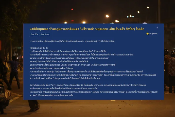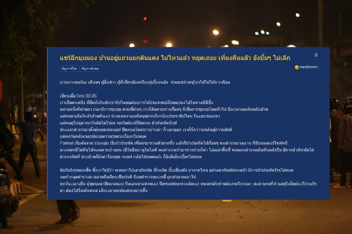 เมื่อวันที่ 5 ก.ย. 64 สมาชิกเว็บไซต์Pantip รายหนึ่งได้โพสต์กระทู้ในหัวข้อ "แชร์อีกมุมมอง บ้านอยู่แถวแยกดินแดง ไม่ไหวแล้ว หยุดเถอะ เที่ยงคืนแลัว ยังบึ้มๆ ไม่เลิก" โดยเป็นประสบการณ์ของผู้ที่อาศัยอยู่แถวแยกดินแดงที่ต้องเจอกับเหตุการชุมนุมของกลุ่มวัยรุ่นที่ก่ความวุ่นวายแทบทุกวันโดยมีเนื้อหาดังนี้