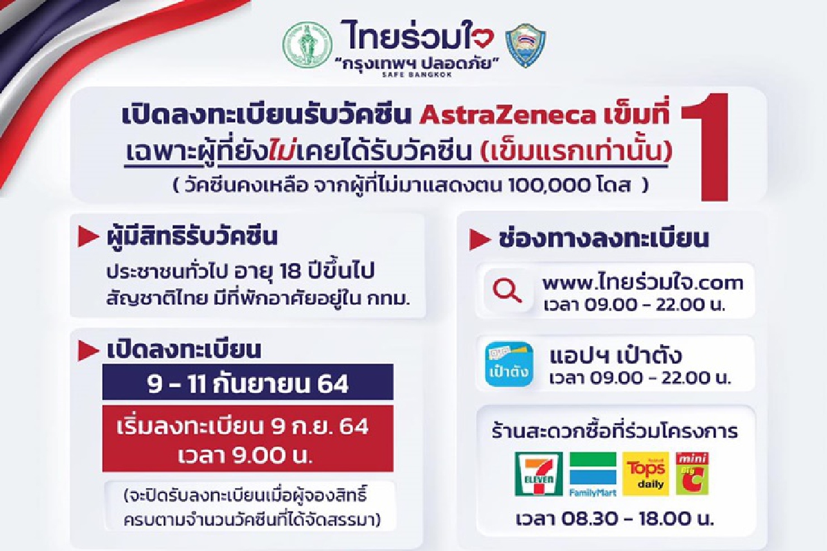 โครงการไทยร่วมใจ กรุงเทพฯ ปลอดภัย เปิดลงทะเบียนรับวัคซีน แอสตร้าเซนเนก้า เข็มที่ 1 เฉพาะผู้ที่ยังไม่เคยได้รับวัคซีน ในกลุ่มประชาชนทั่วไปอายุ 18 ปีขึ้นไป ที่มีสัญชาติไทย ที่พักอาศัยอยู่ใน กทม. ซึ่งเป็นวัคซีนคงเหลือจากผู้ที่ไม่มาแสดงตน จำนวน 100,000 โดส โดยเริ่มลงทะเบียน 9 ก.ย. 64 เวลา 09.00 น. เป็นต้นไป ช่องทางลงทะเบียนเว็บไซต์ www.ไทยร่วมใจ.com เวลา 09.00-22.00 น. แอปพลิเคชันเป๋าตัง เวลา 09.00-22.00 น. ร้านสะดวกซื้อที่ร่วมโครงการ เวลา 08.30-18.00 น. โดยจะเริ่มฉีดวัคซีนวันที่ 14 - 15 ก.ย. 64 ณ หน่วยบริการฉีดวัคซีนโควิด-19 ทั้ง 25 แห่ง ของกรุงเทพมหานคร