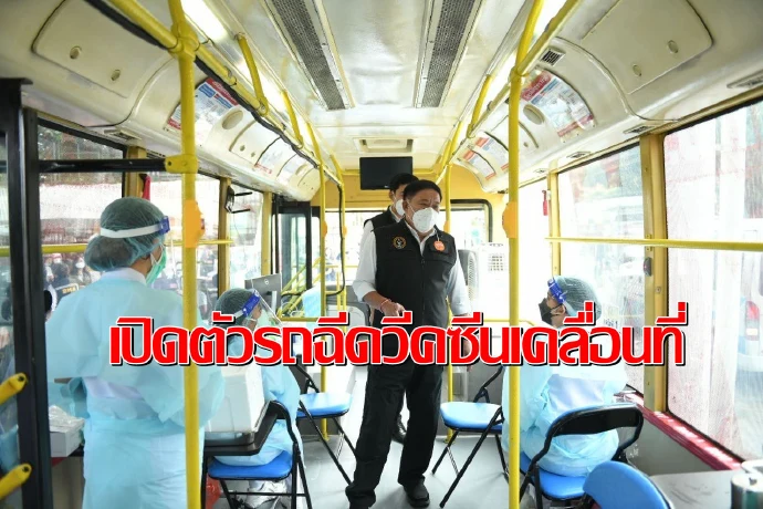 ผู้ว่าฯกทม.เปิดตัวรถฉีดวัคซีนเคลื่อนที่นำรถโดยสารประจำทางมาแปลงสภาพ ภายในมีอุปกรณ์ทางการแพทย์ครบมาตรฐานเดียวกับในโรงพยาบาล มีศักยภาพฉีดได้ 1,000 คนต่อวัน
