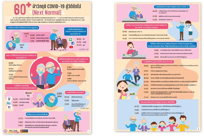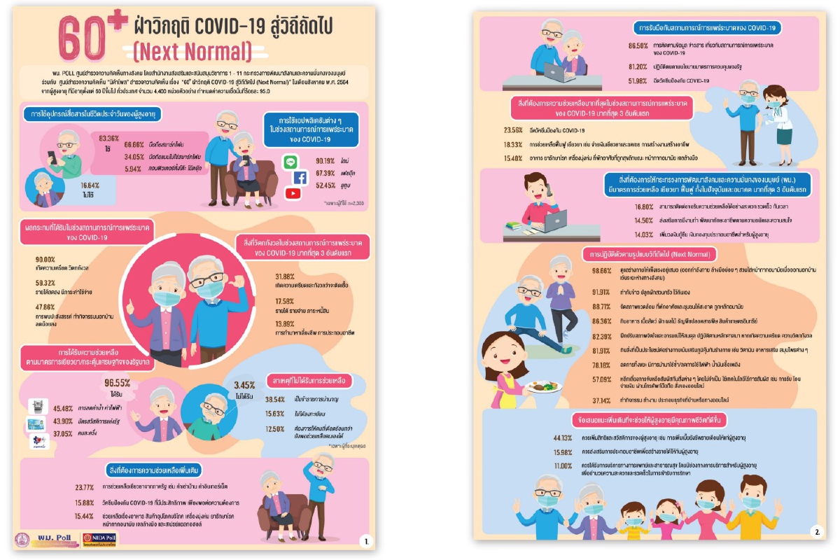 พม. POLL ศูนย์สำรวจความคิดเห็นทางสังคม สำนักงานส่งเสริมและสนับสนุนวิชาการ 1-11 กระทรวงการพัฒนาสังคมและความมั่นคงของมนุษย์ ร่วมกับ ศูนย์สำรวจความคิดเห็น “นิด้าโพล” สถาบันบัณฑิตพัฒนบริหารศาสตร์ (นิด้า) เปิดเผยผลสำรวจ เรื่อง “60+ ฝ่าวิกฤติ COVID-19 สู่วิถีถัดไป (Next Normal)” ทำการสำรวจในเดือนสิงหาคม พ.ศ. 2564 จากผู้สูงอายุมีอายุตั้งแต่ 60 ปีบริบูณ์ขึ้นไป กระจายทุกภูมิภาคทั่วประเทศ ใช้ระเบียบวิธีวิจัยเชิงสำรวจ (Survey Research) โดยใช้วิธีการสุ่มตัวอย่างแบบหลายขั้นตอน (Multi-Stage Sampling) รวมขนาดตัวอย่างทั้งสิ้น จำนวน 4,400 หน่วยตัวอย่าง เก็บรวบรวมข้อมูลด้วยวิธีลงพื้นที่ภาคสนาม และการตอบแบบสอบถามออนไลน์ กำหนดค่าความเชื่อมั่น ร้อยละ 95.00