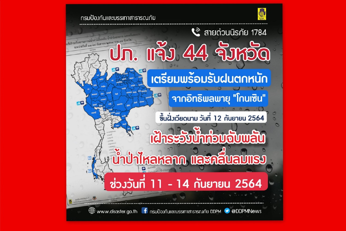 นายบุญธรรม เลิศสุขีเกษม อธิบดีกรมป้องกันและบรรเทาสาธารณภัย (ปภ.) เปิดเผยว่า กองอำนวยการป้องกันและบรรเทาสาธารณภัยกลาง (กอปภ.ก.) ติดตามสภาพอากาศกับกรมอุตุนิยมวิทยาอย่างใกล้ชิด โดยกรมอุตุนิยมวิทยาได้มีประกาศแจ้งว่า พายุโซนร้อนกำลังแรงโกนเซิน บริเวณทะเลจีนใต้ตอนกลาง กำลังเคลื่อนตัวทางทิศตะวันตก คาดว่าเคลื่อนขึ้นฝั่งบริเวณเมืองดานัง เวียดนาม วันที่ 12 กันยายนนี้ ขณะที่มีร่องมรสุมพาดผ่านภาคเหนือตอนล่าง ภาคกลางตอนบน และภาคตะวันออกเฉียงเหนือ ทำให้ประเทศไทยยังคงมีฝนตกต่อเนื่องและมีฝนตกหนักถึงหนักมากบางพื้นที่ รวมถึงมรสุมตะวันตกเฉียงใต้ที่พัดปกคลุมทะเลอันดามัน ภาคใต้ และอ่าวไทยมีกำลังแรง โดยคลื่นลมบริเวณทะเลอันดามันมีคลื่นสูง 2-3 เมตร และอ่าวไทยบริเวณที่มีฝนฟ้าคะนองคลื่นสูงมากกว่า 3 เมตร กอปภ.ก. โดย ปภ. จึงได้ประสานแจ้งไปยัง 44 จังหวัด เตรียมพร้อมรับมือฝนตกหนักและเฝ้าระวังน้ำท่วมฉับพลันน้ำป่าไหลหลาก และคลื่นลมแรงในช่วงวันที่ 12-14 กันยายนนี้