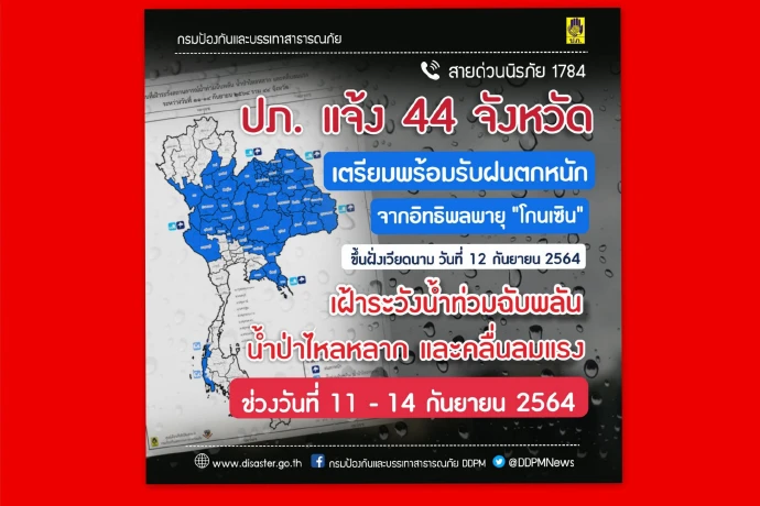 ปภ.เปิดรายชื่อ44จังหวัด พื้นที่เฝ้าระวังสถานการณ์น้ำท่วมฉับพลัน และน้ำป่าไหลหลาก เหนือ10 จังหวัด อีสาน20จังหวัด ใต้2จังหวัดคลื่นลมแรง