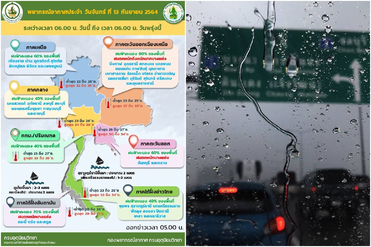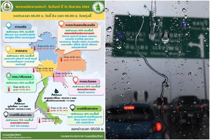 เมื่อวันที่ 13 ก.ย. 64 กรมอุตุนิยมวิทยารายงาน ลักษณะอากาศทั่วไป ดังนี้ พยากรณ์อากาศ 24 ชั่วโมงข้างหน้า บริเวณภาคตะวันออกเฉียงเหนือมีฝนตกหนักถึงหนักมากบางพื้นที่ ส่วนภาคเหนือ ภาคตะวันออก และภาคใต้ฝั่งตะวันตกมีฝนตกหนักบางแห่ง ขอให้ประชาชนที่อาศัยอยู่ในพื้นที่เสี่ยงภัยบริเวณดังกล่าว ระวังอันตรายจากฝนตกหนักและฝนที่ตกสะสมซึ่งอาจทำให้เกิดน้ำท่วมฉับพลัน และน้ำป่าไหลหลากไว้ด้วย
