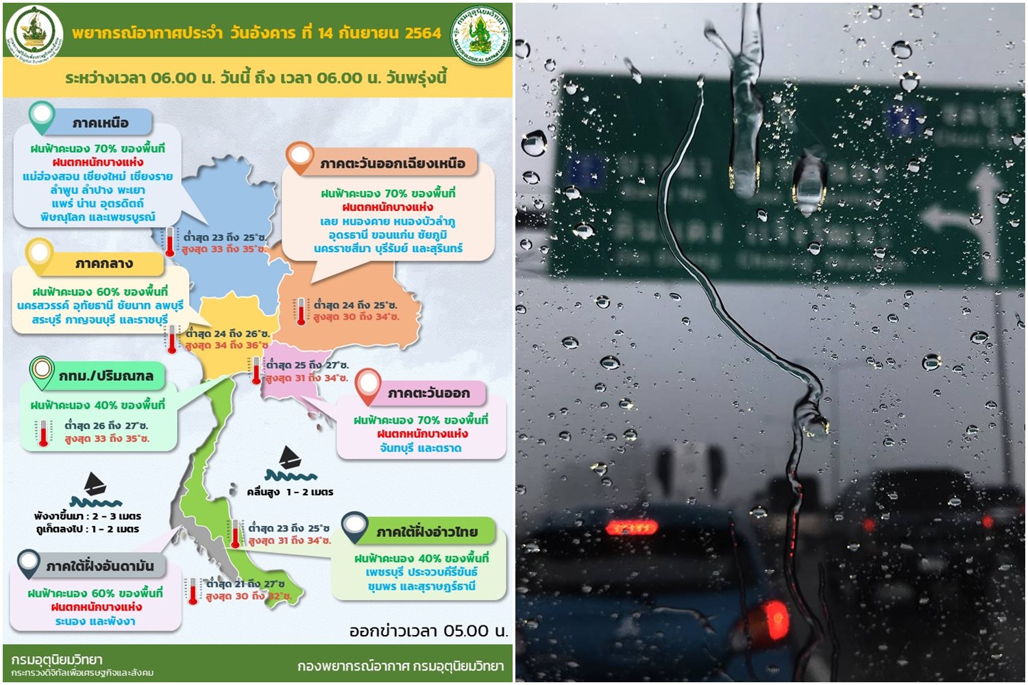 เมื่อวันที่ 14 ก.ย. 64 กรมอุตุนิยมวิทยารายงาน ลักษณะอากาศทั่วไป ดังนี้ พยากรณ์อากาศ 24 ชั่วโมงข้างหน้า ร่องมรสุมพาดผ่านภาคเหนือตอนล่าง ภาคกลางตอนบน และภาคตะวันออกเฉียงเหนือ เข้าสู่หย่อมความกดอากาศต่ำบริเวณประเทศลาวตอนล่าง ประกอบกับมรสุมตะวันตกเฉียงใต้ที่พัดปกคลุมทะเลอันดามัน ภาคใต้ และอ่าวไทยมีกำลังค่อนข้างแรง
