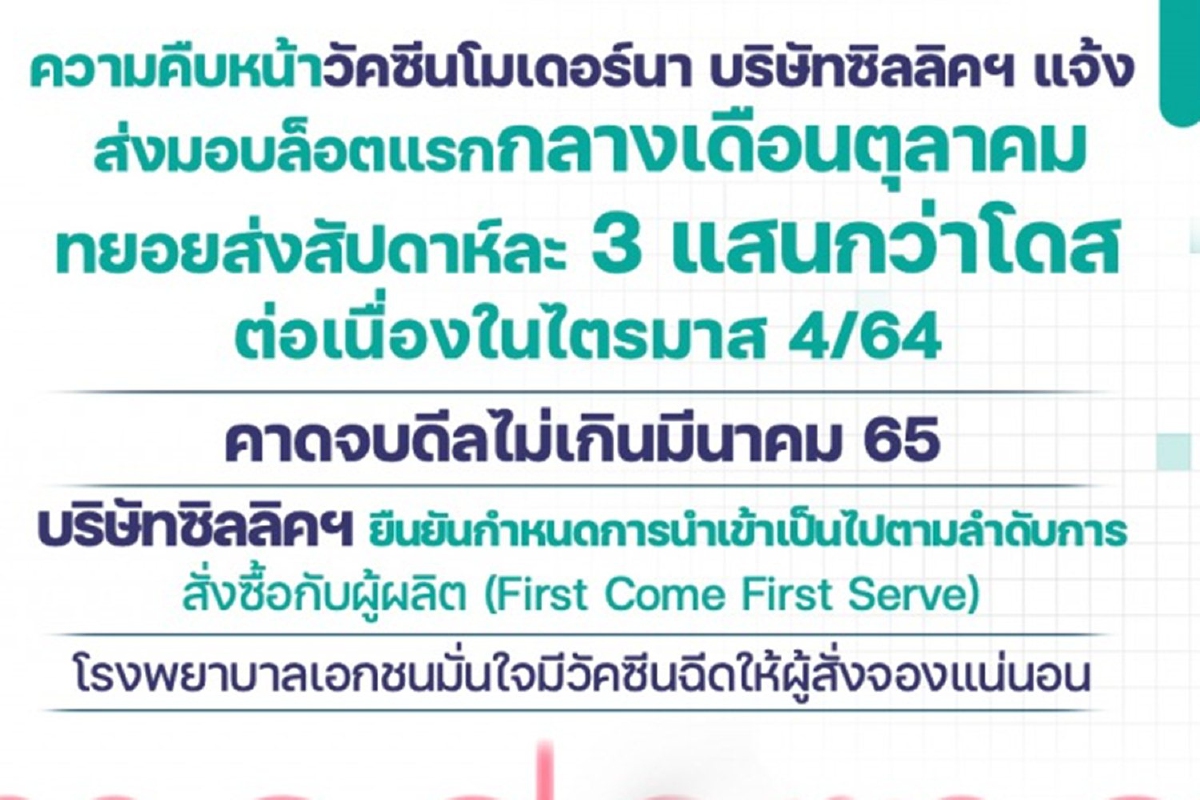 บริษัทซิลลิคฯ ยืนยันกำหนดการนำเข้าวัคซีนโมเดอร์นาเป็นไปตามลำดับการสั่งซื้อกับผู้ผลิต โรงพยาบาลเอกชนมั่นใจมีวัคซีนฉีดให้ผู้สั่งจองแน่นอน