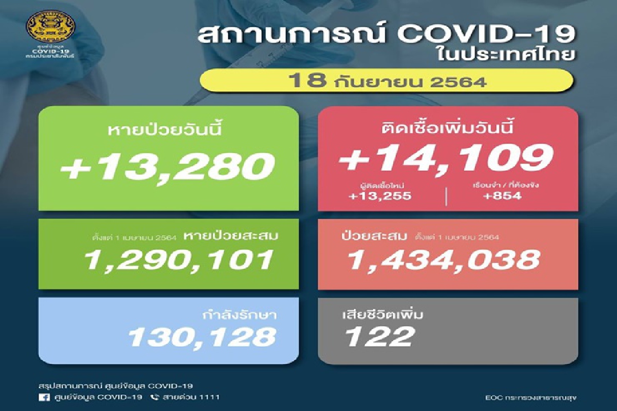 ศบค. เผย ยอดติดเชื้อโควิด-19 วันนี้ เพิ่มขึ้น 14,109 ราย เสียชีวิตอีก 122 ราย หายป่วยกลับบ้าน 13,280 ราย เหลือกำลังรักษา 130,128 ราย