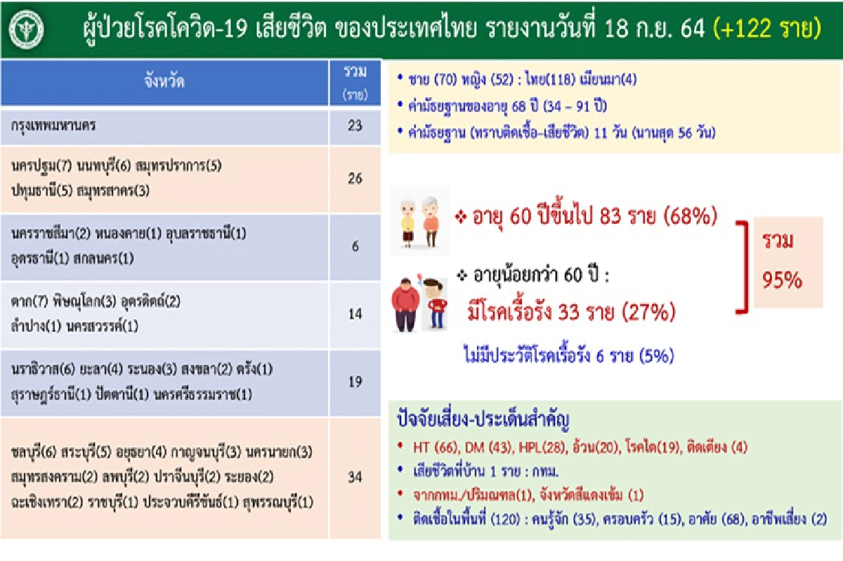 -ผู้เสียชีวิตเพิ่มขึ้น 122 ราย / ยอดสะสม 15,246 ราย เป็นชาย 70 ราย หญิง52 ราย อายุระหว่าง 34-91 ปี เป็นชาวไทย 118รายเมียนมา 4 ราย โดย อายุ 60 ปี ขึ้นไป 83 ราย อายุต่ำกว่า 60 ปี มีโรคเรื้อรัง 33 ราย ไม่มีประวัติโรคเรื้อรัง 6 ราย เสียชีวิตที่บ้าน 1 ราย (กทม.) โดยกทม. เสียชีวิตสูงสุด 23ราย โดย ปัจจัยเสี่ยงต่อความรุนแรงของโรค ส่วนใหญ่มีโรคประจำตัว โรคความดันโลหิตสูง เบาหวาน HPL โรคไต โรคอ้วน ติดเตียง ส่วนปัจจัยเสี่ยงต่อการติดเชื้อ ติดเชื้อในพื้นที่ คนรู้จัก ครอบครัว อาศัยในพื้นที่ระบาด และอาชีพเสี่ยง