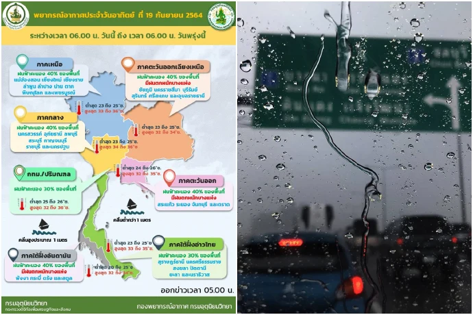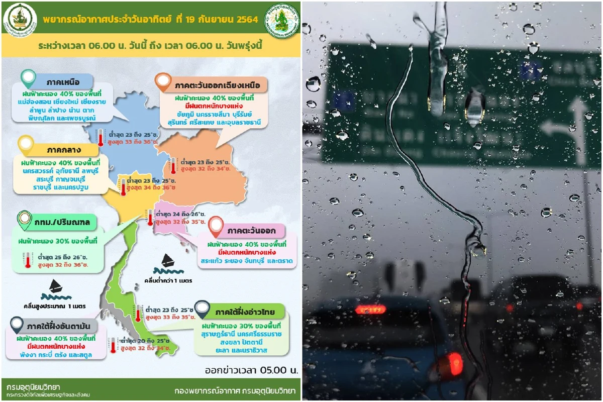 เมื่อวันที่ 19 ก.ย. 64 กรมอุตุนิยมวิทยารายงาน ลักษณะอากาศทั่วไป ดังนี้ พยากรณ์อากาศ 24 ชั่วโมงข้างหน้า มรสุมตะวันตกเฉียงใต้กำลังอ่อนพัดปกคลุมทะเลอันดามัน ภาคใต้ และอ่าวไทย ลักษณะเช่นนี้ทำให้ประเทศไทยมีฝนฟ้าคะนองเกิดขึ้น โดยมีฝนตกหนักบางแห่งในภาคตะวันออกเฉียงเหนือ ภาคตะวันออก และภาคใต้ฝั่งตะวันตก