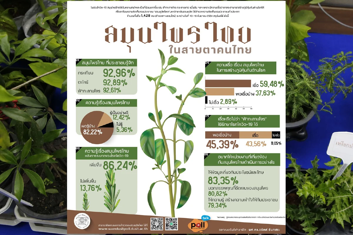 ดุสิตโพลเผยการระบาดของโควิดทำให้คนไทยมีความรู้เรื่องสมุนไพรเพิ่มขึ้น 45.39% พอเชื่อบ้างว่าฟ้าทะลายโจรใช้รักษาโรค โควิด-19 ได้
