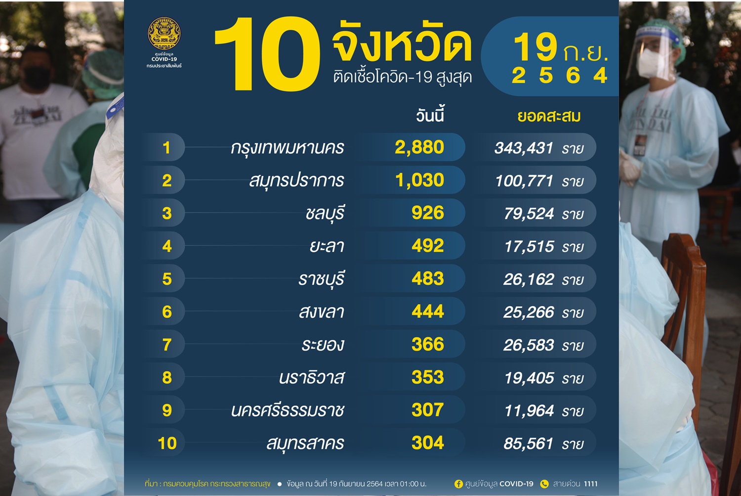 เมื่อวันที่ 19 ก.ย.ศูนย์บริหารสถานการณ์โควิด-19 (ศบค.)รายงานสถานการณ์การแพร่ระบาดของไวรัสโควิด-19 รายใหม่สูงสุดในวันนี้ 10 อันดับแรก ได้แก่