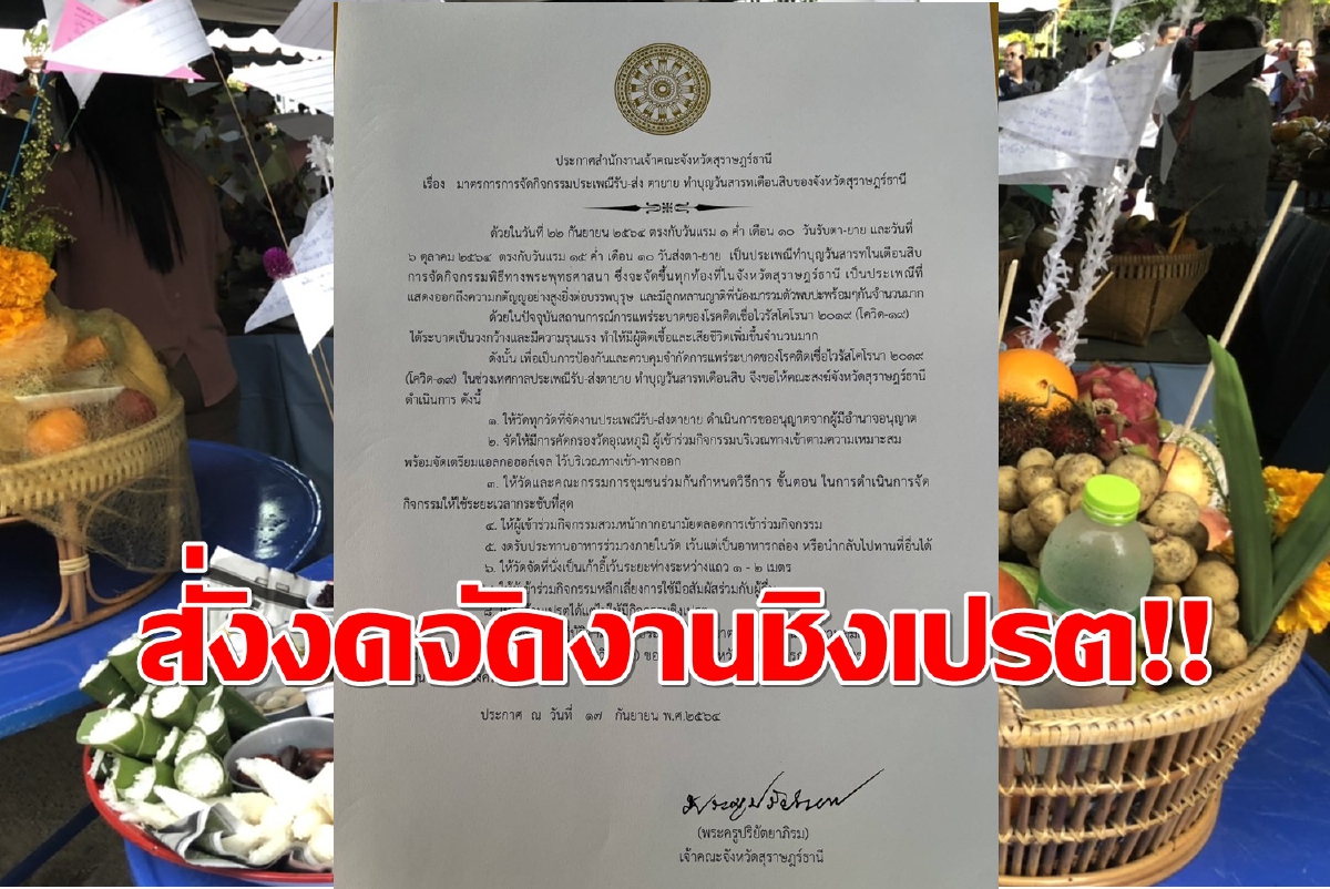 เจ้าคณะจังหวัดสุราษฎร์ห่วงญาติโยมร่วมงานทำบุญสารทเดือนสิบแพร่ระบาดโควิด สั่งทุกวัดจัดงานให้กระชับที่สุดห้ามล้อมกินข้าว-งดจัดชิงเปรตหวั่นเป็นคลัสเตอร์แพร่เชื้อ