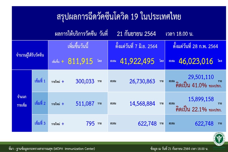 -ยอดการฉีดวัคซีนโควิด-19 ให้แก่ประชาชนตั้งแต่ประเทศไทยเริ่มฉีดวัคซีนโควิด-19 เมื่อวันที่ 28 ก.พ.64 จนถึง 21 กย. 64 พบว่า มียอดฉีดวัคซีนสะสมแล้ว46,023,016 โดส แยกเป็น เข็มที่ 1 จำนวน 29,501,110ราย และเข็มที่ 2 จำนวน 15,899,158 ราย เข็มที่ 3 จำนวน 622,748 กราย เฉพาะวันที่ 21 ก.ย. 64 ฉีดวัคซีนยอดรวม 811,915 ราย