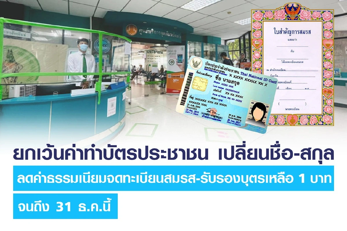 นางสาวรัชดา ธนาดิเรก รองโฆษกประจำสำนักนายกรัฐมนตรี เปิดเผยว่า รัฐบาลได้ยกเว้นค่าทำบัตรประชาชน เปลี่ยนชื่อ-สกุล และลดค่าจดทะเบียนสมรส-รับรองบุตรเหลือ 1 บาท ถึง 31 ธ.ค.นี้
