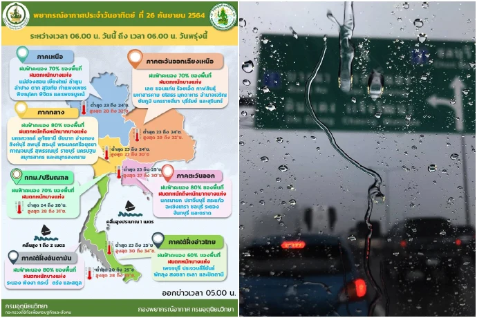 เมื่อวันที่ 26 ก.ย. 64 กรมอุตุนิยมวิทยารายงาน ลักษณะอากาศทั่วไปดังนี้ พยากรณ์อากาศ 24 ชั่วโมงข้างหน้า บริเวณภาคกลาง และภาคตะวันออก มีฝนตกหนักถึงหนักมากบางพื้นที่ โดยมีฝนตกหนักบางแห่งในภาคเหนือ ภาคตะวันออกเฉียงเหนือ และภาคใต้ รวมทั้งกรุงเทพมหานครและปริมณฑล ขอให้ประชาชนในบริเวณพื้นที่เสี่ยงภัยระวังอันตรายจากฝนตกหนักและฝนที่ตกสะสม ซึ่งอาจทำให้เกิดน้ำท่วมฉับพลันและน้ำป่าไหลหลากในระยะนี้ไว้ด้วย