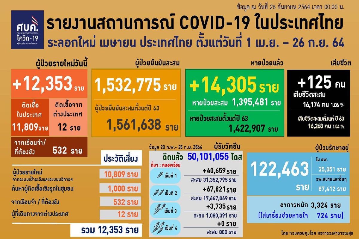 เมื่อวันที่ 26 ก.ย. 64 ศูนย์บริหารสถานการณ์โควิด-19 (ศบค.) รายงานสถานการณ์การแพร่ระบาดของไวรัสโควิด-19 ในประเทศประจำวันดังนี้