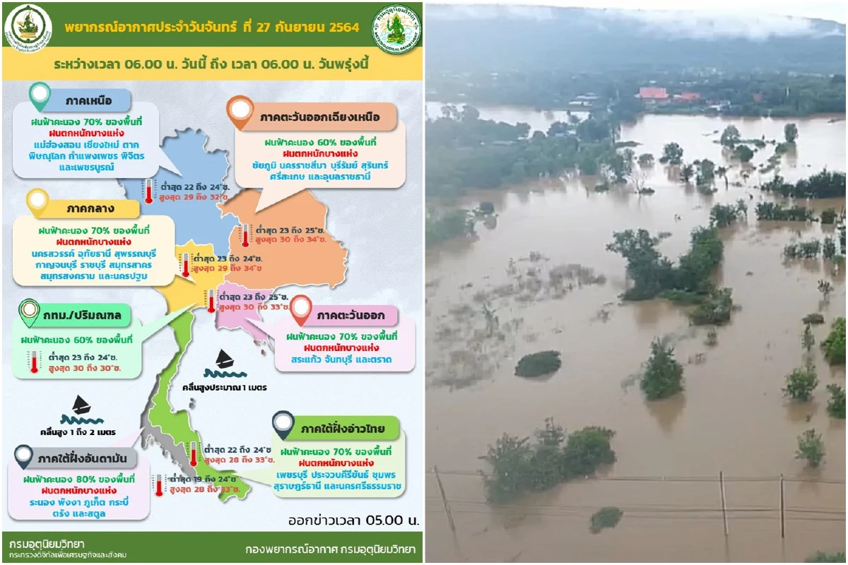 เมื่อวันที่ 27ก.ย.64 กรมอุตุนิยมรายงานลักษณะอากาศทั่วไป ดังนี้ พยากรณ์อากาศ 24 ชั่วโมงข้างหน้า บริเวณภาคเหนือ ภาคตะวันออกเฉียงเหนือตอนล่าง ภาคกลาง ภาคตะวันออก และภาคใต้มีฝนตกหนักบางพื้นที่ ขอให้ประชาชนในบริเวณพื้นที่เสี่ยงภัยระวังอันตรายจากฝนตกหนักและฝนที่ตกสะสม ซึ่งอาจทำให้เกิดน้ำท่วมฉับพลันและน้ำป่าไหลหลากในระยะนี้ไว้ด้วย