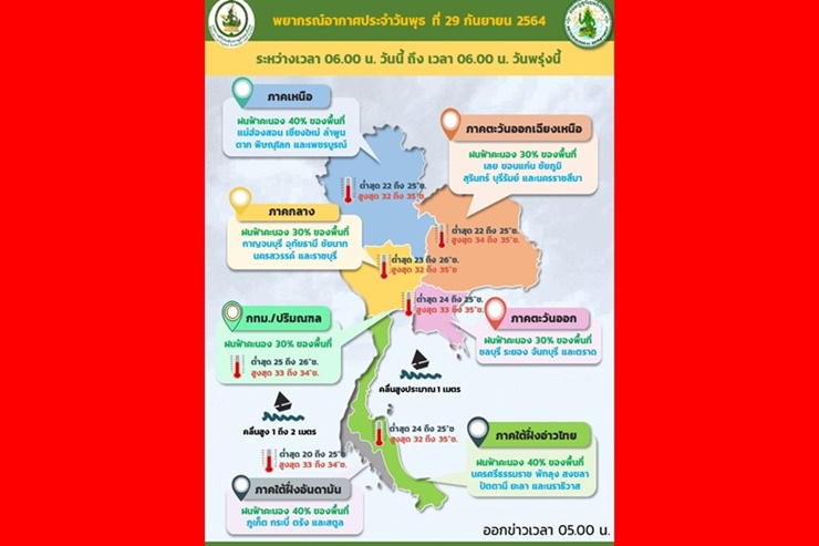 กรมอุตุนิยมวิทยา พยากรณ์อากาศประจำวันที่29 กย. 2564 ลักษณะอากาศทั่วไป พยากรณ์อากาศ 24 ชั่วโมงข้างหน้า บริเวณประเทศไทยมีฝนลดลง ทั้งนี้เนื่องจากลมตะวันออกและลมตะวันออกเฉียงเหนือพัดปกคลุมประเทศไทย ในขณะที่มรสุมตะวันตกเฉียงใต้ที่พัดปกคลุมทะเลอันดามัน ประเทศไทย และอ่าวไทยมีกำลังอ่อน