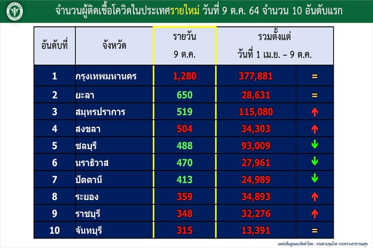 -จํานวนผู้ติดเชื้อโควิดในประเทศรายใหม่ วันนี้ 10 จังหวัดอันดับแรก 1.กรุงเทพมหานคร 1,280 ราย 2.ยะลา 650 ราย 3.สมุทรปราการ 519 ราย 4.สงขลา 504 ราย 5.ชลบุรี 488 ราย 6.นราธิวาส 470 ราย 7.ปัตตานี 413 ราย 8.ระยอง 359 ราย 9.ราชบุรี 348 ราย และ 10.จันทบุรี 315 ราย