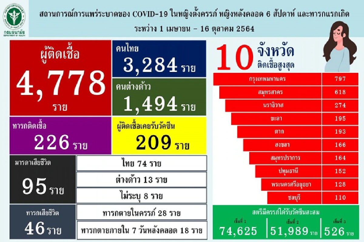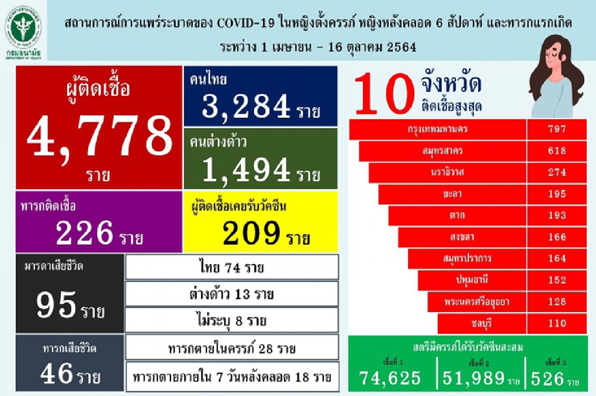 กระทรวงสาธารณสุข เผยหญิงตั้งครรภ์ที่ติดเชื้อ-เสียชีวิต ส่วนใหญ่ยังไม่ฉีดวัคซีน พบ 1 เม.ย.-16 ตค. ดับแล้ว 95 ศพ เด็กในครรภ์ตาย 46 ชีวิต อันตรายกว่าผลข้างเคียง ย้ำวัคซีนที่นำเข้ามามีความปลอดภัย