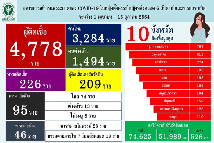 สำหรับช่วง 6 เดือนที่ผ่านมา ตั้งแต่ 1 เม.ย. - 16 ต.ค. 2564 มีหญิงตั้งครรภ์ติดเชื้อโควิด 19 จำนวน 4,778 ราย ส่วนใหญ่อยู่ในกทม. ปริมณฑล และ 3 จังหวัดชายแดนใต้ ทารกติดเชื้อจากมารดา 226 ราย หญิงตั้งครรภ์เสียชีวิต 95 ราย ทารกที่อยู่ในครรภ์เสียชีวิต 46 ราย กระทรวงสาธารณสุขได้เร่งฉีดวัคซีนให้หญิงตั้งครรภ์ตั้งแต่เดือนก.ค. 2564 ตั้งเป้าหมาย 1 แสนคน ขณะนี้ฉีดวัคซีนเข็มแรกแล้ว 7.5 หมื่นคน เข็มสอง 5.1 หมื่นคน และได้รับการกระตุ้นเข็ม 3 จำนวน 526 คนส่วนใหญ่เป็นเจ้าหน้าที่สาธารณสุขที่ตั้งครรภ์ ภาพรวมผลหลังการรณรงค์ฉีดวัคซีนในระดับเขตสุขภาพ พบว่า ภาคตะวันออกฉีดได้สูงสุด 40% และภาคกลาง อาทิ ปทุมธานี พระนครศรีอยุธยา ได้กว่า 30% ส่วนภาคอีสานฉีดได้เพียง 10-20%