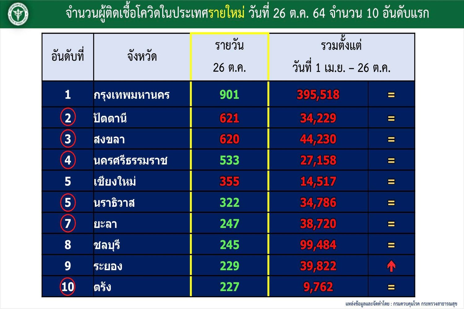 -จังหวัดที่มีรายงานผู้ติดเชื้อรายใหม่สูงสุด 10 อันดับแรก ได้แก่ กรุงเทพมหานคร 901 ราย, ปัตตานี 621 ราย, สงขลา 620 ราย, นครศรีธรรมราช 533 ราย, เชียงใหม่ 355 ราย, นราธิวาส 322 ราย, ยะลา 247 ราย, ชลบุรี 245 ราย, ระยอง 229 ราย และตรัง 227 ราย