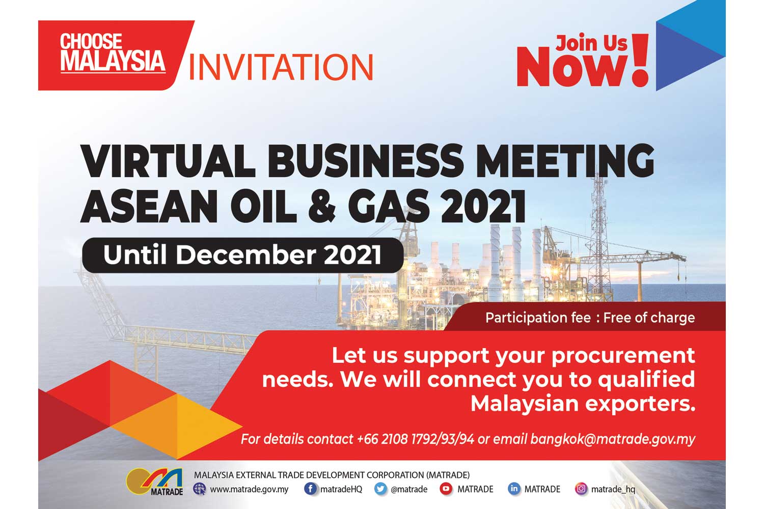 Malaysia External Trade Development Corporation (MATRADE) ในกรุงเทพฯ ขอเชิญบริษัทไทยในอุตสาหกรรมน้ำมันและแก๊ส (O&G) ภาคเคมีและพลังงานที่เชื่อมโยงเข้ากับธุรกิจมาเลเซีย โดยใช้ประโยชน์จากการจัดประชุมธุรกิจทางออนไลน์ที่จัดขึ้นจนถึงสิ้นเดือนธันวาคม พ.ศ. 2564 สำหรับข้อมูลเพิ่มเติม กรุณาติดต่อทาง MATRADE Bangkok ได้ที่ [email protected]