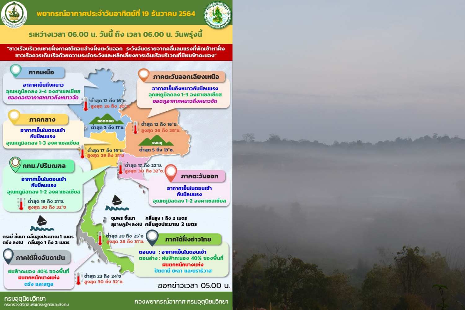 เมื่อวันที่ 19 ธ.ค. 64 กรมอุตุนิยมวิทยารายงาน ลักษณะอากาศทั่วไป ดังนี้ พยากรณ์อากาศ 24 ชั่วโมงข้างหน้า บริเวณความกดอากาศสูงหรือมวลอากาศเย็นกำลังค่อนข้างแรงปกคลุมประเทศไทยตอนบน