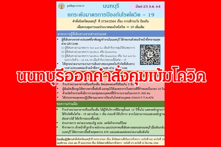 จังหวัดนนทบุรี ยกระดับมาตรการป้องกันโควิด-19 ออกประกาศคำสั่งที่ 3734/2564 ห้ามจัดคอนเสิร์ต งดกิจกรรมรวมกลุ่มเกิน 500 คน มีผล 23ธ.ค.64
