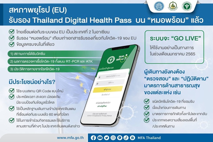 เพจเฟซบุ๊ก ศูนย์ข้อมูล COVID-19 รายงาน สหภาพยุโรป (EU)รับรอง Thailand Digital Health Pass บน "หมอพร้อม" เพื่อใช้ในการเดินทางเข้า 60 ประเทศ/ดินแดน ที่ EU ให้การรับรอง ซึ่งประเทศไทยเป็นลำดับที่ 2 ของอาเซียน โดยจะเริ่มใช้งานได้ในเดือนมกราคม 2565