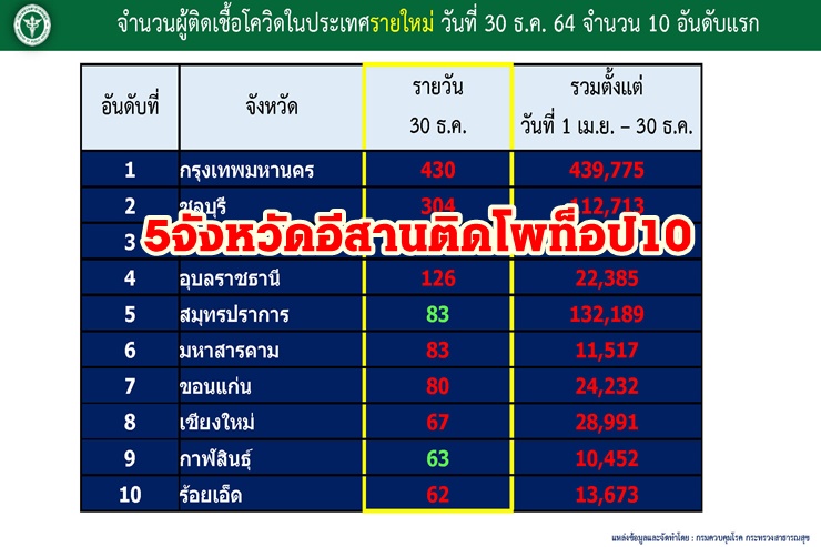 ศบค. เผย 10 จังหวัดติดเชื้อสูงสุด กทม.อันดับ 1 ที่ 430 ราย ตามด้วย "ชลบุรี-นครศรีฯ" จับตา 5 จังหวัดอีสานยอดพุ่ง ติดโผท็อป 10