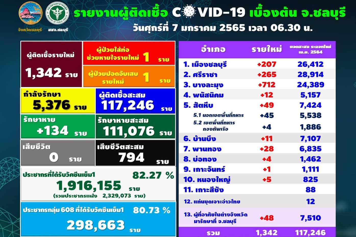 เมื่อวันที่ 7 ม.ค. 65 สำนักงานสาธารณสุขจังหวัดชลบุรี รางานสถานการณ์ระบาดของเชื้อโควิด-19 ในพื้นที่จังหวัด ดังนี้