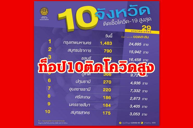 เปิด 10 จว.ติดโควิดสูง กทม.ยังแชมป์เกินพันราย ปริมณฑล ชลบุรี ยอดยังสูง