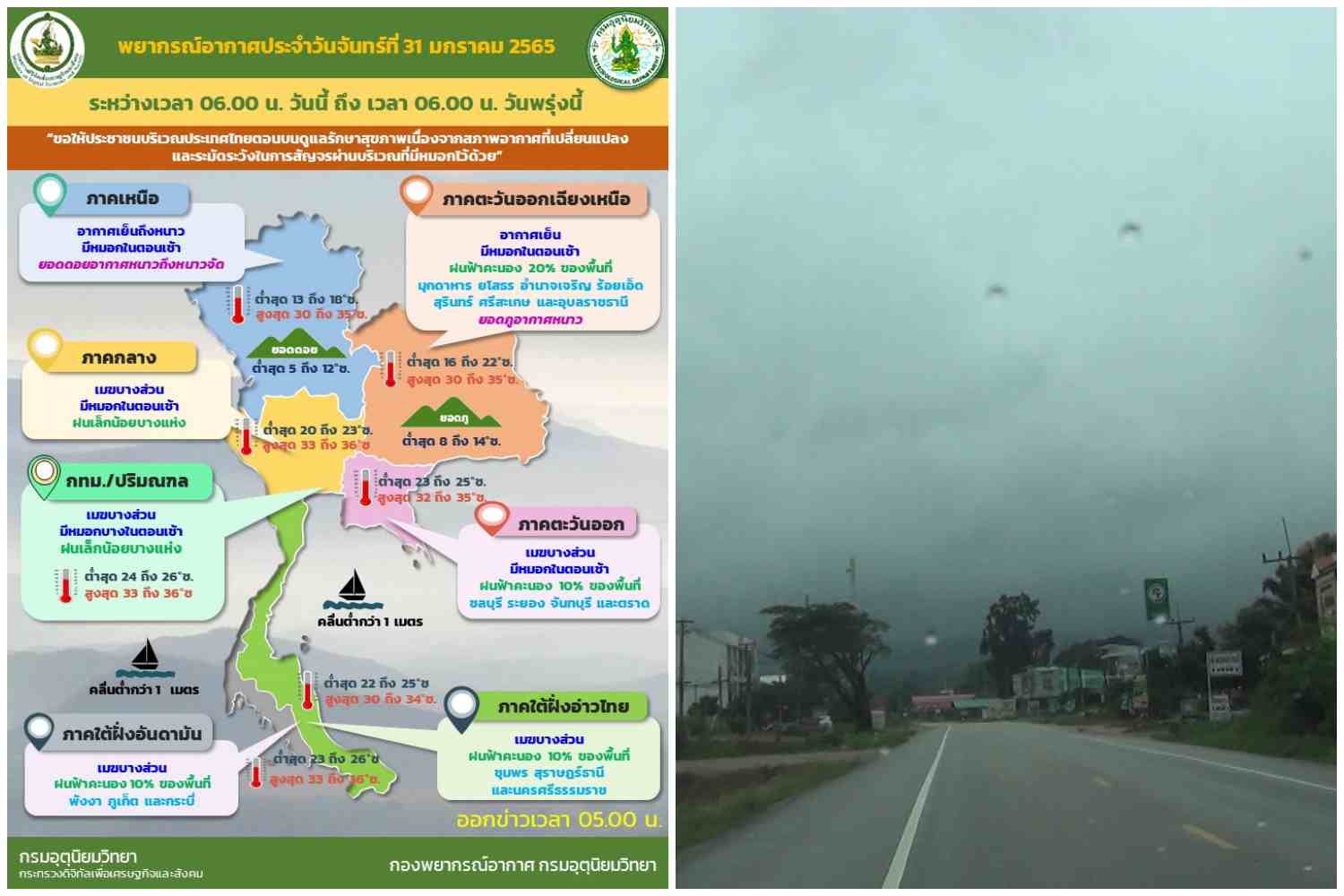 ในขณะที่บริเวณความกดอากาศสูงหรือมวลอากาศเย็นระลอกใหม่จากประเทศจีนได้แผ่ลงมาปกคลุมถึงประเทศลาวตอนบน เวียดนามตอนบน และทะเลจีนใต้แล้ว คาดว่าจะแผ่ลงมาปกคลุมภาคตะวันออกเฉียงเหนือตอนบนของประเทศไทยในวันนี้ (31 ม.ค. 65) ส่งผลให้มีลมใต้และลมตะวันออกเฉียงใต้พัดนำความชื้นจากทะเลเข้ามาปกคลุมภาคตะวันออกและภาคตะวันออกเฉียงเหนือ ทำให้บริเวณดังกล่าวมีฝนฟ้าคะนองบางแห่ง ขอให้ประชาชนบริเวณดังกล่าวดูแลรักษาสุขภาพเนื่องจากสภาพอากาศที่เปลี่ยนแปลง และระมัดระวังการสัญจรผ่านบริเวณที่มีหมอกไว้ด้วย